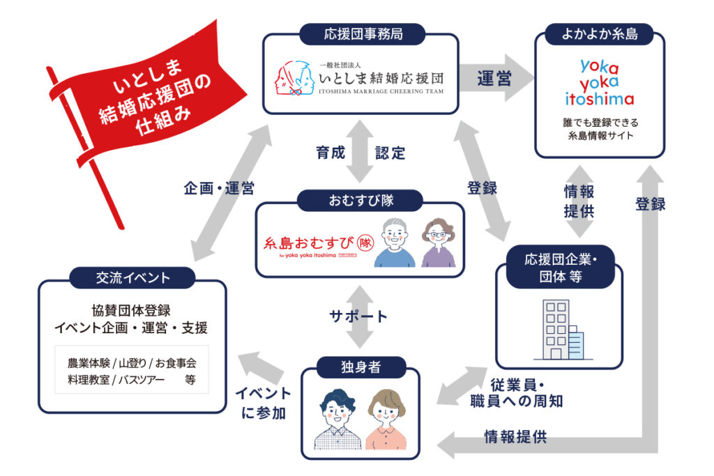 この団体は、いとしま結婚応援団(以下、本団体)と称し、糸島市においても高まりつつある生涯未婚率、ひいては少子化に歯止めをかけるため、現代社会に即した「おせっかい」活動を行い、糸島市を元気にし、市民幸福度の向上に寄与することを目的とする。